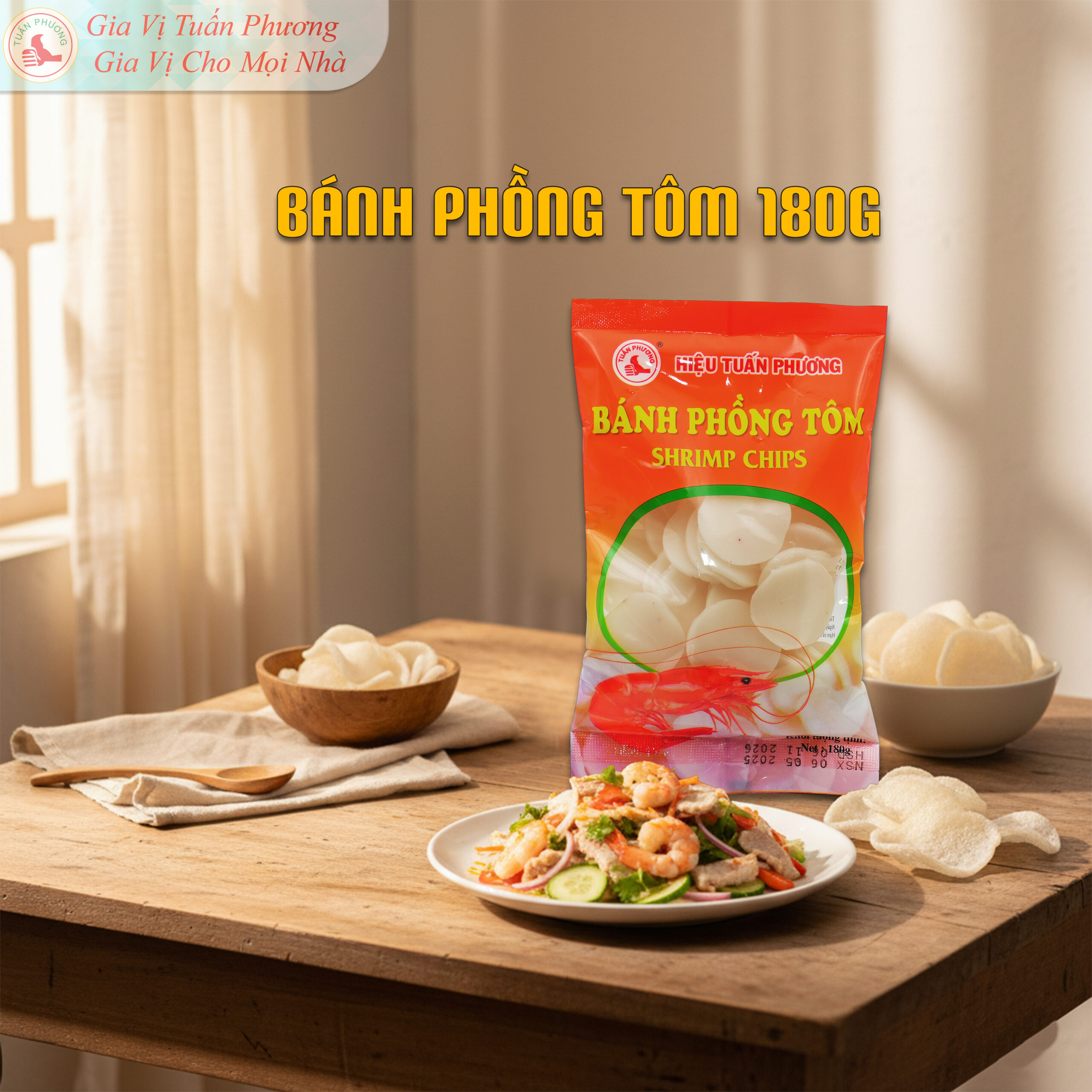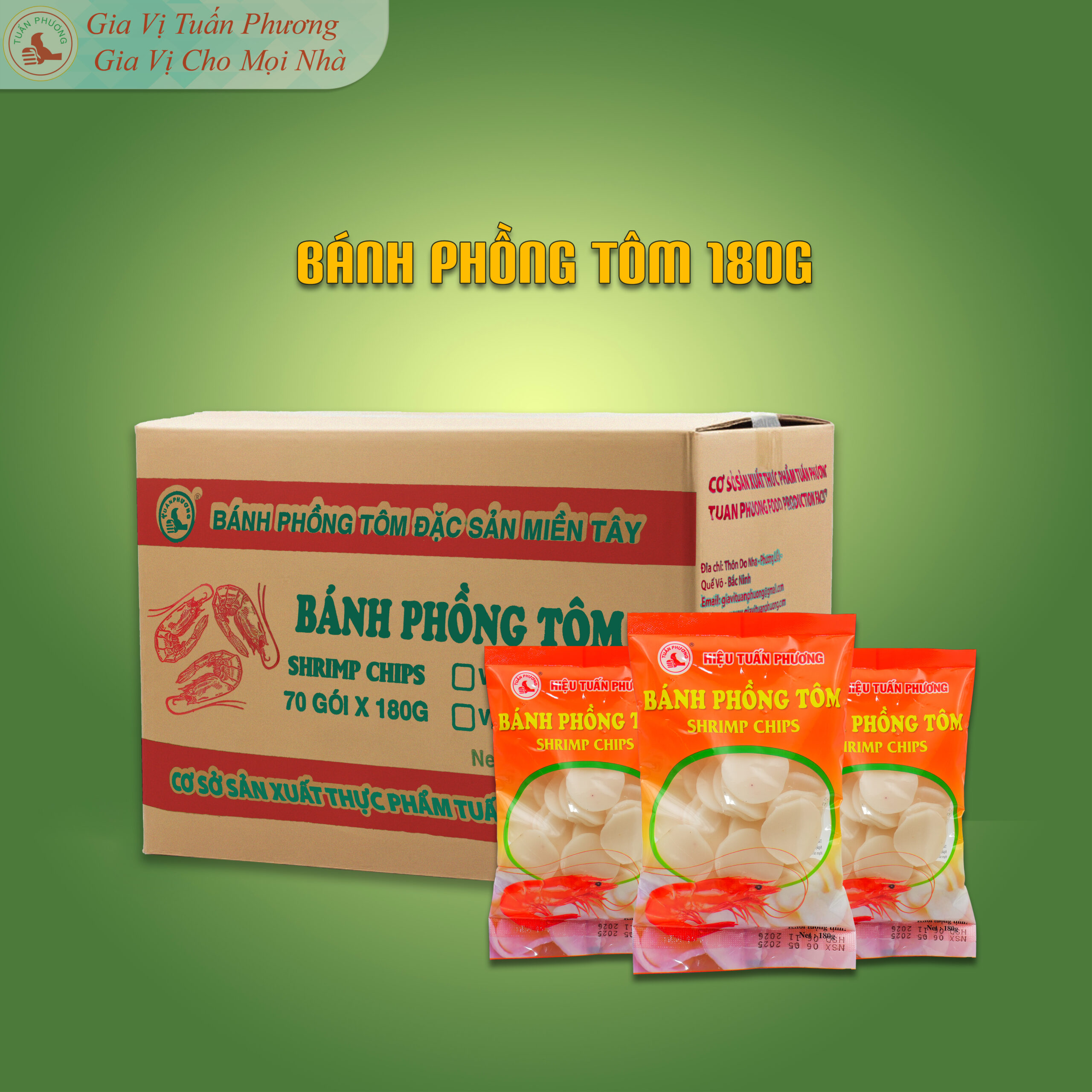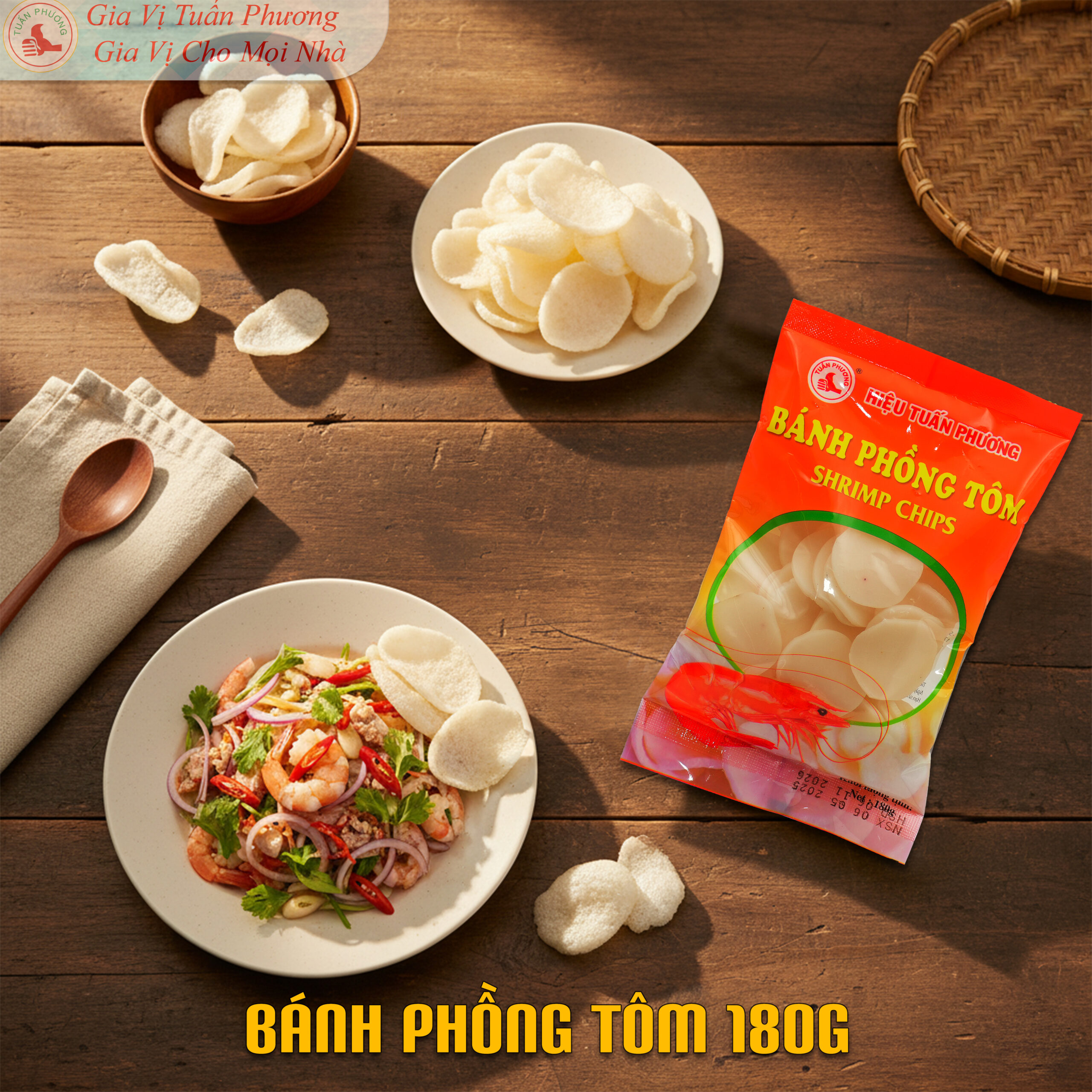 Bánh phồng tôm Tuấn Phương 180g là sản phẩm tiện lợi, phù hợp cho quán ăn, quán nhậu, nhà hàng và bếp kinh doanh. Bánh phồng tôm Tuấn Phương được sản xuất từ nguyên liệu chọn lọc, độ nở cao, khi chiên lên giòn tan và thơm mùi tôm đặc trưng. Thích hợp dùng trong bữa ăn gia đình, tiệc, liên hoan hoặc ăn vặt hằng ngày.